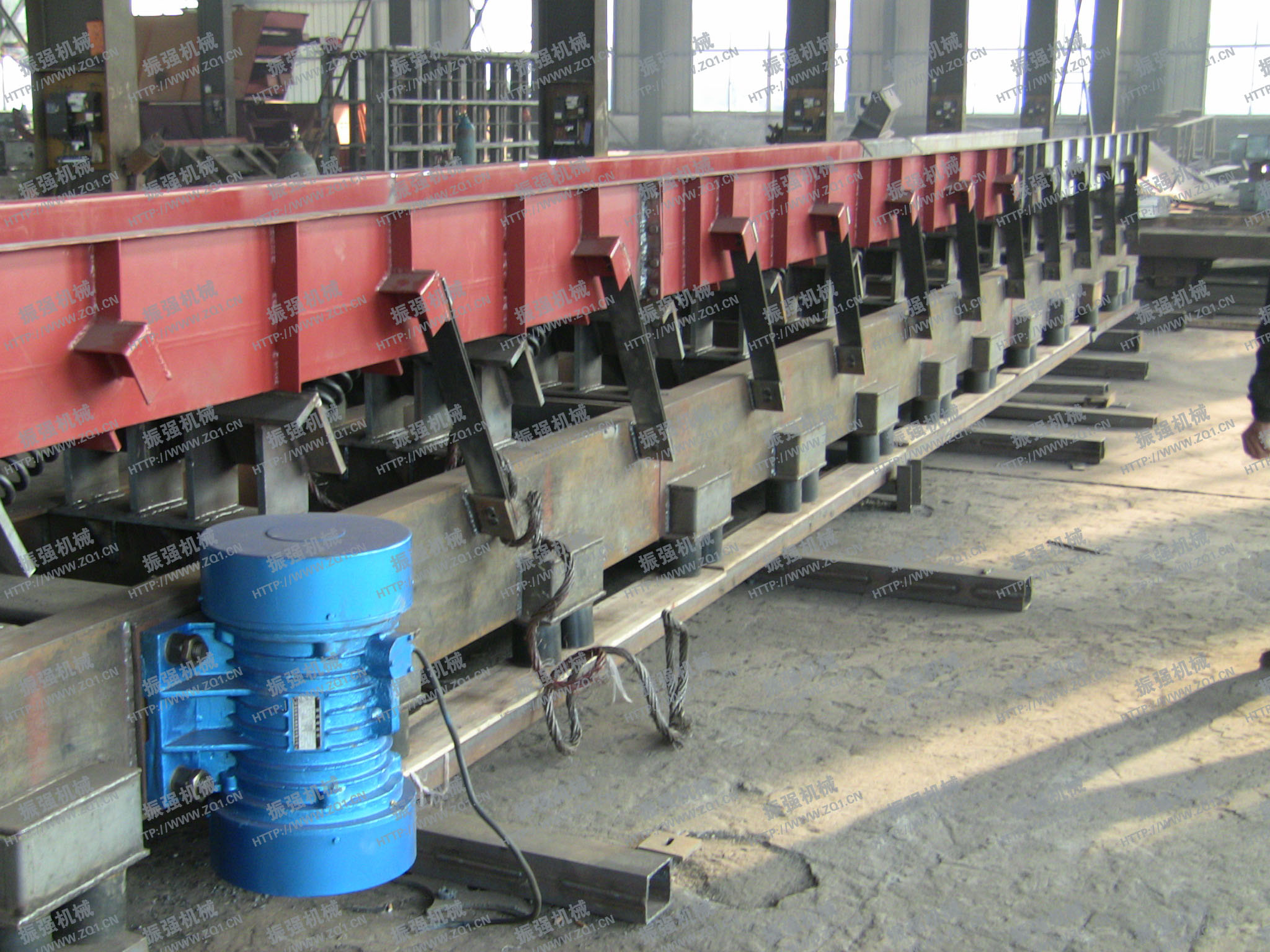 - SZF型慣性振動(dòng)輸送機(jī)采用兩臺(tái)振動(dòng)電機(jī)作為激振動(dòng)源,運(yùn)用自同步原理,兩臺(tái)振動(dòng)電機(jī)反向轉(zhuǎn)動(dòng),使輸送機(jī)底部平衡架產(chǎn)生往復(fù)振動(dòng),經(jīng)過主振簧與導(dǎo)向板簧的作用,帶動(dòng)上部輸送槽振動(dòng),從而達(dá)到輸送物料的目的。該機(jī)是一種通用輸送機(jī)械,除用于水泥行業(yè)外,還可用于冶金、礦山、化工、電力等行業(yè),是一種理想的新型輸送設(shè)備。